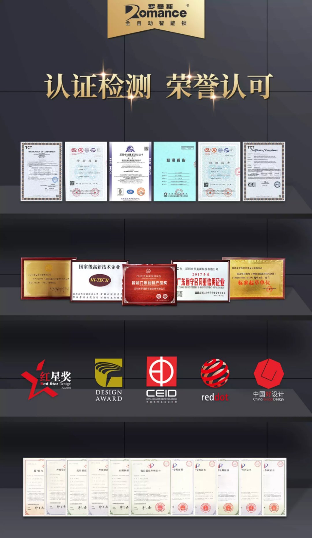 ? ? ? 羅曼斯作為上市集團奮達科技旗下的控股品牌,是目前行業中在生產規模、自動化程度、研發能力、工藝品質等方面具備領先優勢的智能鎖生產基地。羅曼斯始終以“為創造客戶價值”為己任,堅信只有精益求精的智作,才能獲得卓越的品質,為消費者打造出更具價值的產品。國際領先制造設備、強大的研發實力和嚴格的質量管理體系,保證了羅曼斯出眾的工藝和卓越的品質,這是實力的體現,亦是對消費者的承諾。