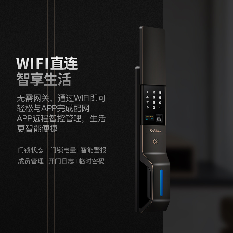 內置WiFi芯片,數據加密傳輸,安全可靠。WiFi 信號穩定,通訊距離遠,穿墻能力強,無需忍受網關的諸多缺點。 羅曼斯智能鎖WiFi直連版,支持查看門鎖常態動態,每次一開門都記錄,直接通過 WIFI傳送至手機APP 終端。并 人性化設計一次性臨時密碼,可以通過微信或者短信方式發送到客人接收端,而且在規定時間內使用一次立即失效,既保證了家里安全,又避免了客人朋友在外面就等的不方便。