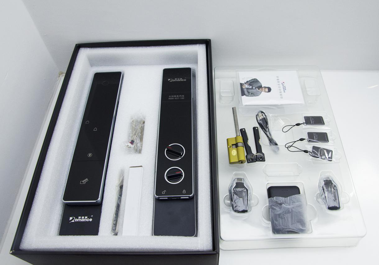 下面我們來看一下A8的全體成員:前后鎖板各一個、鎖芯、前后鎖板連接線1條、2把鑰匙、2個遙控器、3張IC卡、充電寶1個、充電線1條、螺絲配件包1份、三包服務1份等。零件基本做工細致,用手摸上去,觸感光滑,很有質感。
